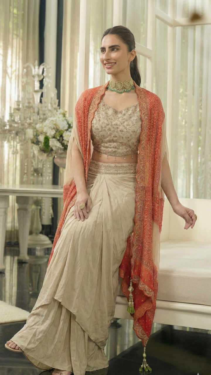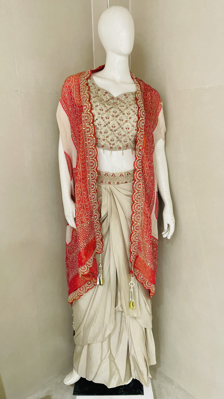 Beige Indo-Western Crop Top Draped Skirt with Cape Set