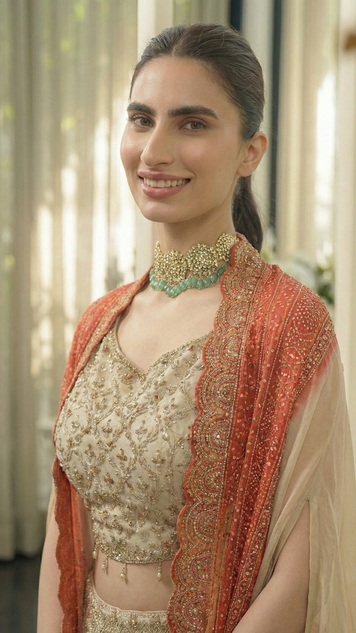 Step into the spotlight with an indo-western fusion that redefines modern elegance. Crafted for the contemporary woman, this stunning ensemble features a delicate crop top with intricate mirror, zari, resham and stones work detailing and beaded droppings at the scalloped hem that pairs perfectly with a unique draped skirt. The skirt's flowing silhouette and artistic folds create a dynamic and sophisticated look, offering both comfort and style while the delicate matching embroidery on its waistband add to its grace. Completing the set is a beautifully embroidered cape with mirror, zari and stones work while its bandhani print, scalloped edges and tassels, add a layer of regal charm and a touch of traditional artistry to this chic, modern outfit. This three-piece set is an effortless blend of traditional aesthetics and modern design, making it a standout choice for any special occasion. To style this versatile set, pair it with minimal yet striking accessories to let the outfit shine. Opt for delicate gold or silver earrings and a matching bracelet to complement the detailed embroidery. A pair of elegant heels, such as strappy sandals or embellished block heels, will complete the look. Carry a simple clutch to hold your essentials, and you're ready to make a statement with an outfit that's both classic and trend-setting.