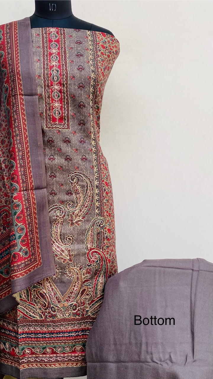 Beige Woollen Pashmina Suit Length 3 Piece With Woollen Pashmina Shawl & Gray Colour Pashmina Bottom