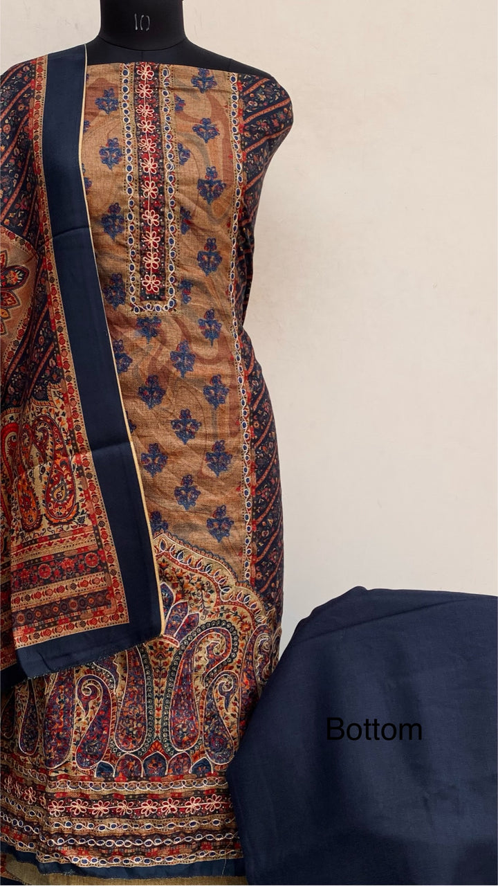 Navy Blue Woollen Pashmina Suit Length 3 Piece With Woollen Pashmina Shawl
