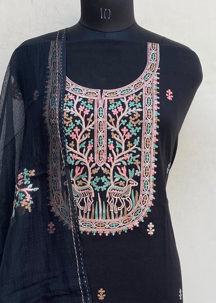 Black Woollen Pashmina Suit Length 3 Piece With Embroidered Kota Dupatta