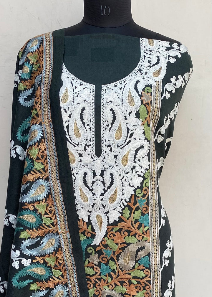 Black Woollen Pashmina Suit Length 3 Piece With Embroidered Woollen Pashmina Shawl & Same Colour Pashmina Bottom