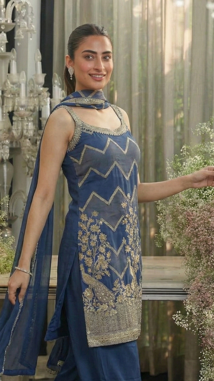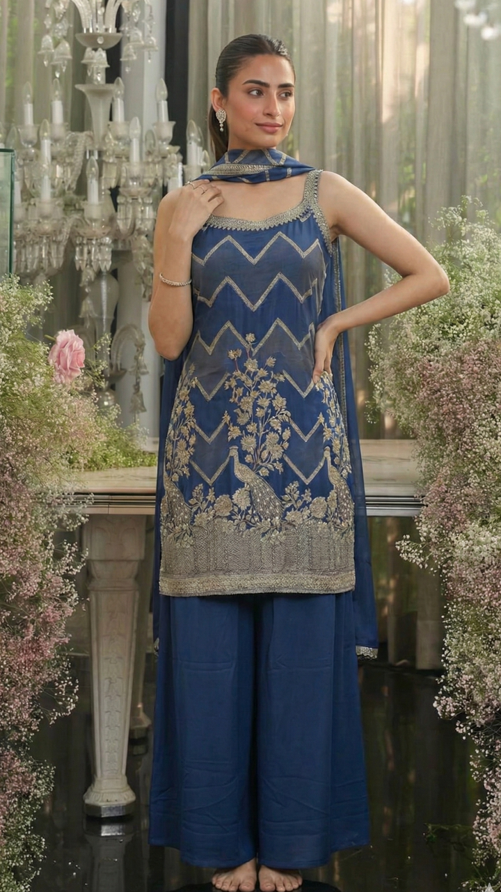 Celebrate tradition with a fresh twist – this Banarsi Silk short kurti palazzo set is the perfect blend of vibrant hues, timeless craft, and modern-day charm. This stunning suit set features a short kurti with intricate Peackock Design in a beautiful blue colour. Perfect for Diwali this dress is the perfect pick this festive season