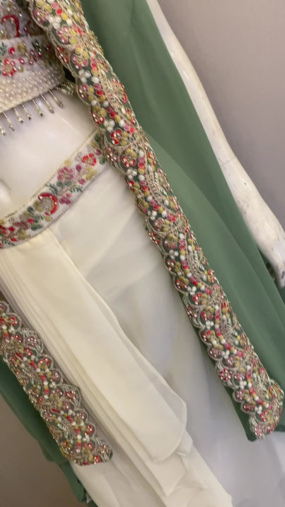 Completing the look is a sheer sage-green cape with richly embellished borders, adding a contemporary layer of sophistication. The scalloped embroidery and refined craftsmanship make this outfit perfect for weddings, receptions, festive celebrations, and special occasions.