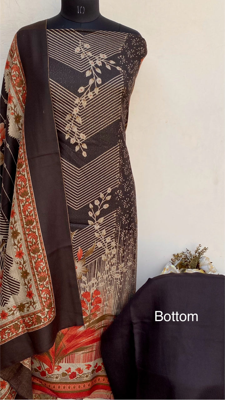 Brown Woollen Pashmina Suit Length 3 Piece With Woollen Pashmina Shawl & Same Colour Pashmina Bottom