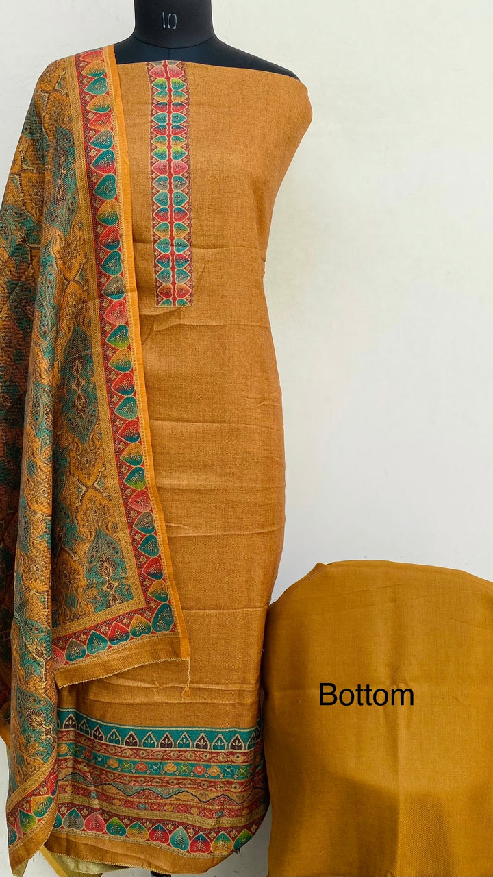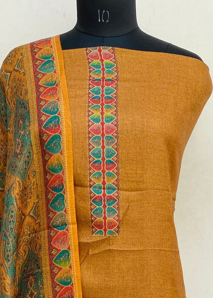 Brown Woollen Pashmina Suit Length 3 Piece With Woollen Pashmina Shawl & Same Colour Pashmina Bottom