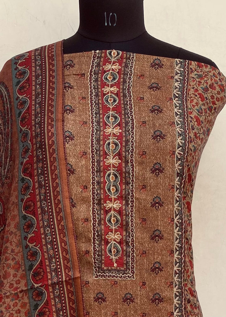 Brown Woollen Pashmina Suit Length 3 Piece With Woollen Pashmina Shawl
