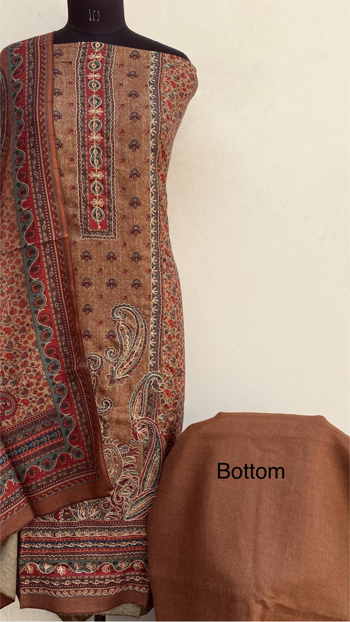 Brown Woollen Pashmina Suit Length 3 Piece With Woollen Pashmina Shawl & Same Colour Pashmina Bottom
