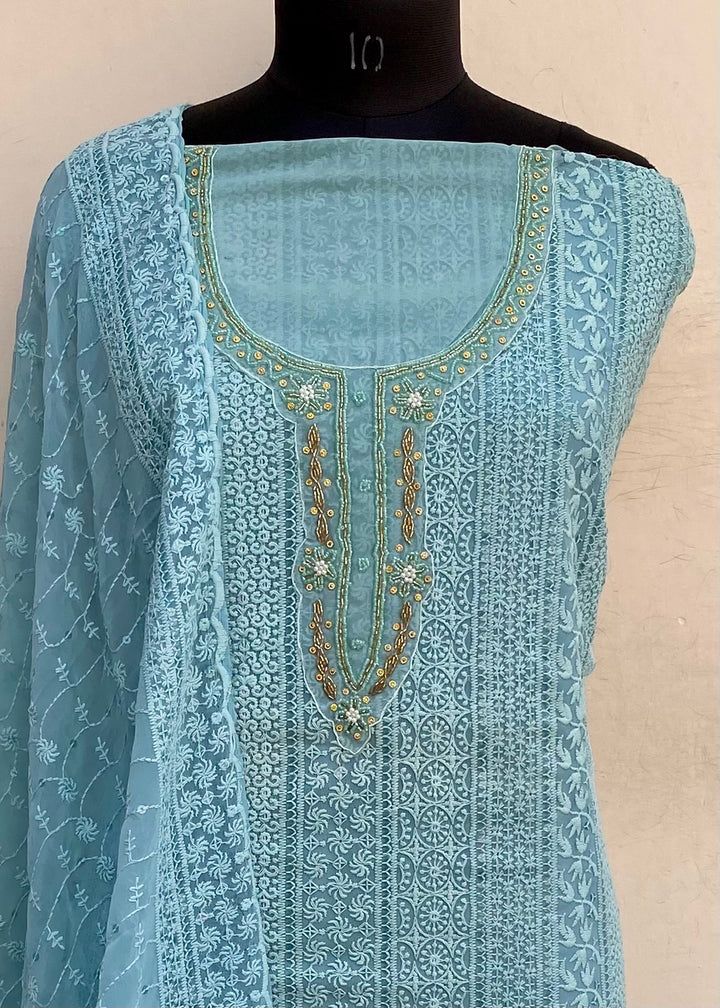 Chikankari Suit Length 3 Piece Aqua Blue Georgette With Pearl & Cutdana Work