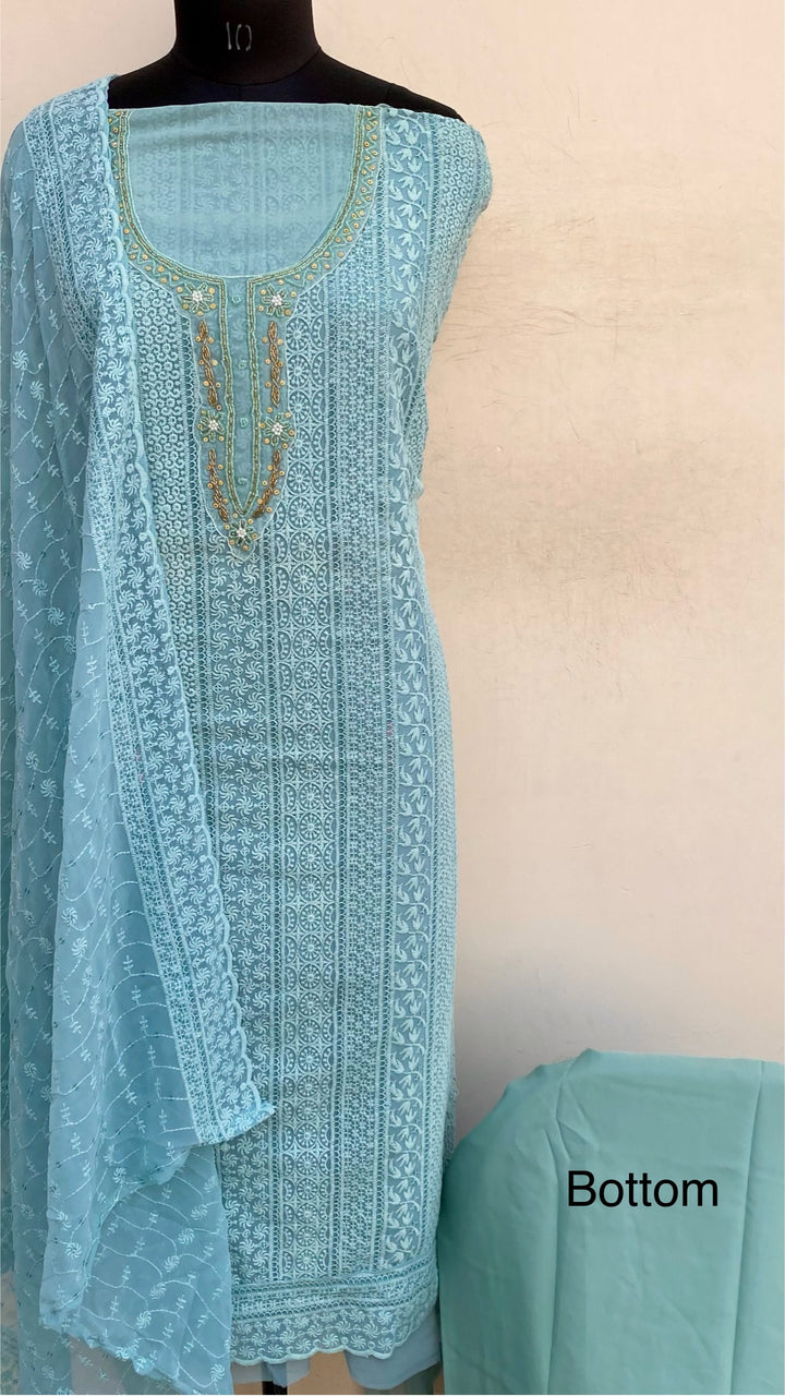 Chikankari Suit Length 3 Piece Aqua Blue Georgette With Pearl & Cutdana Work With Embroidered Georgette Dupatta & Same Colour Santoon Bottom