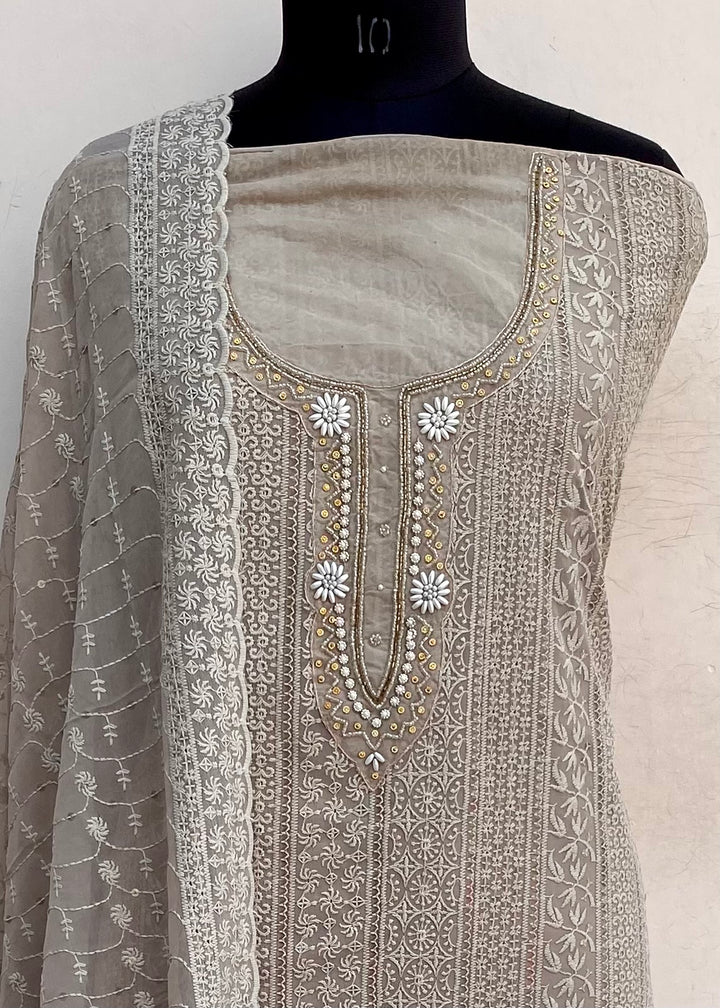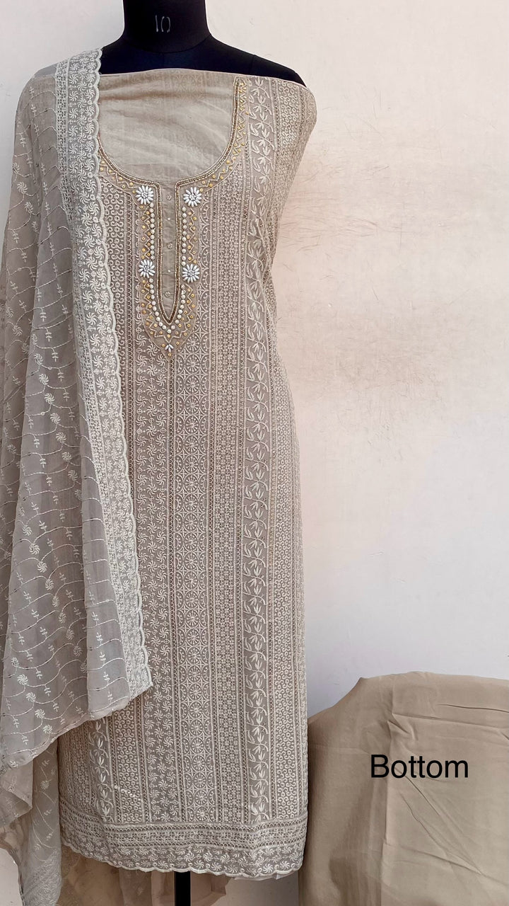 Chikankari Suit Length 3 Piece Beige Georgette With Pearl & Cutdana Work With Embroidered Georgette Dupatta & Same Colour Santoon Bottom
