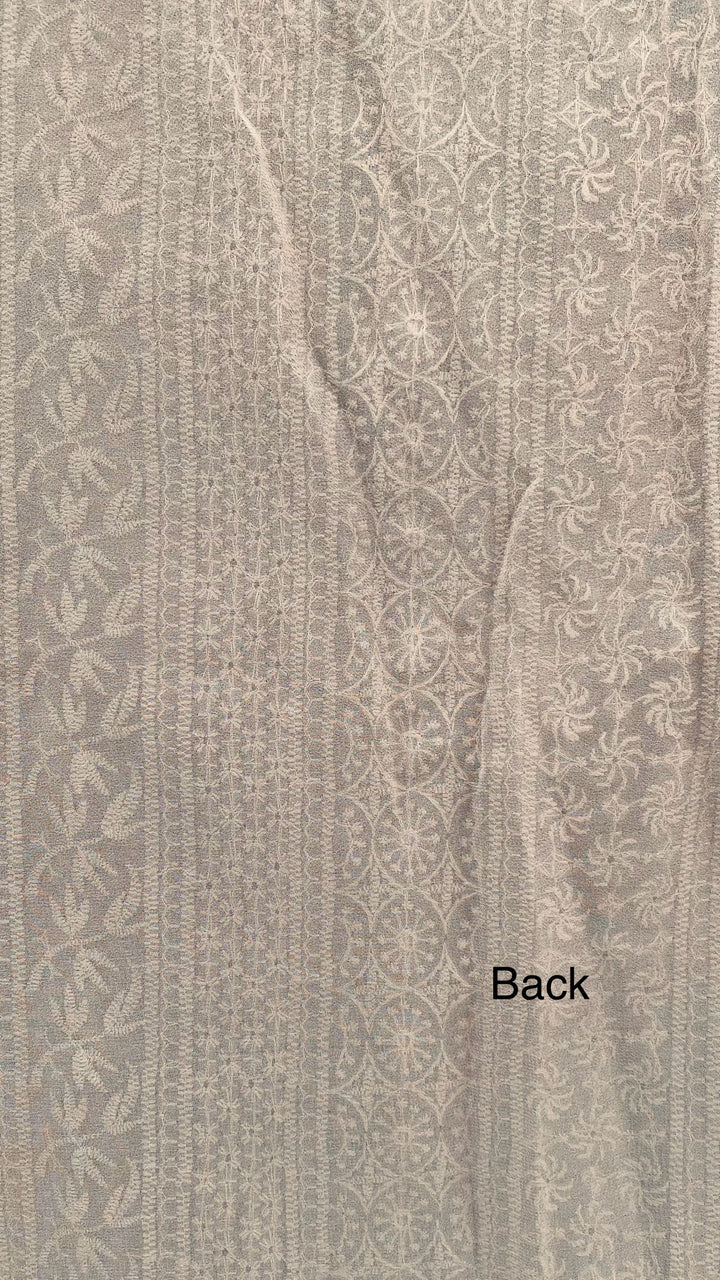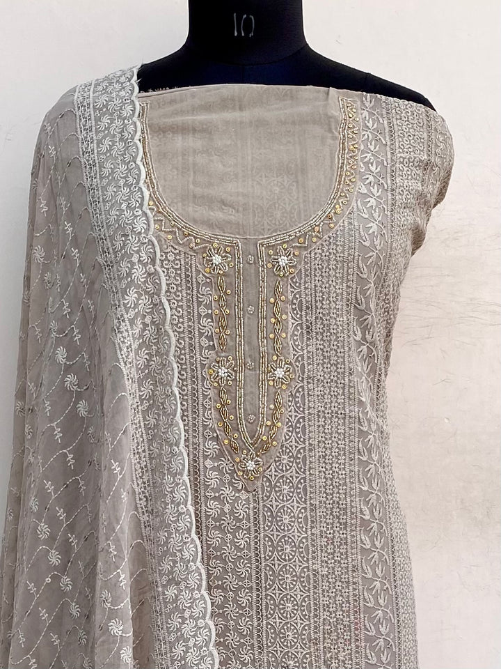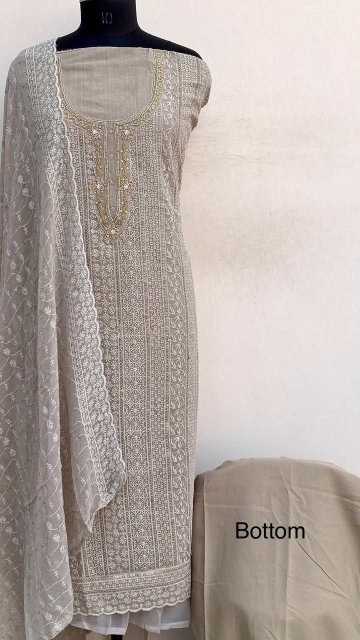 Chikankari Suit Length 3 Piece Beige Georgette With Pearl & Cutdana Work With Embroidered Georgette Dupatta & Same Colour Santoon Bottom
