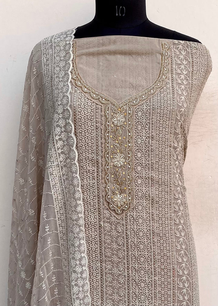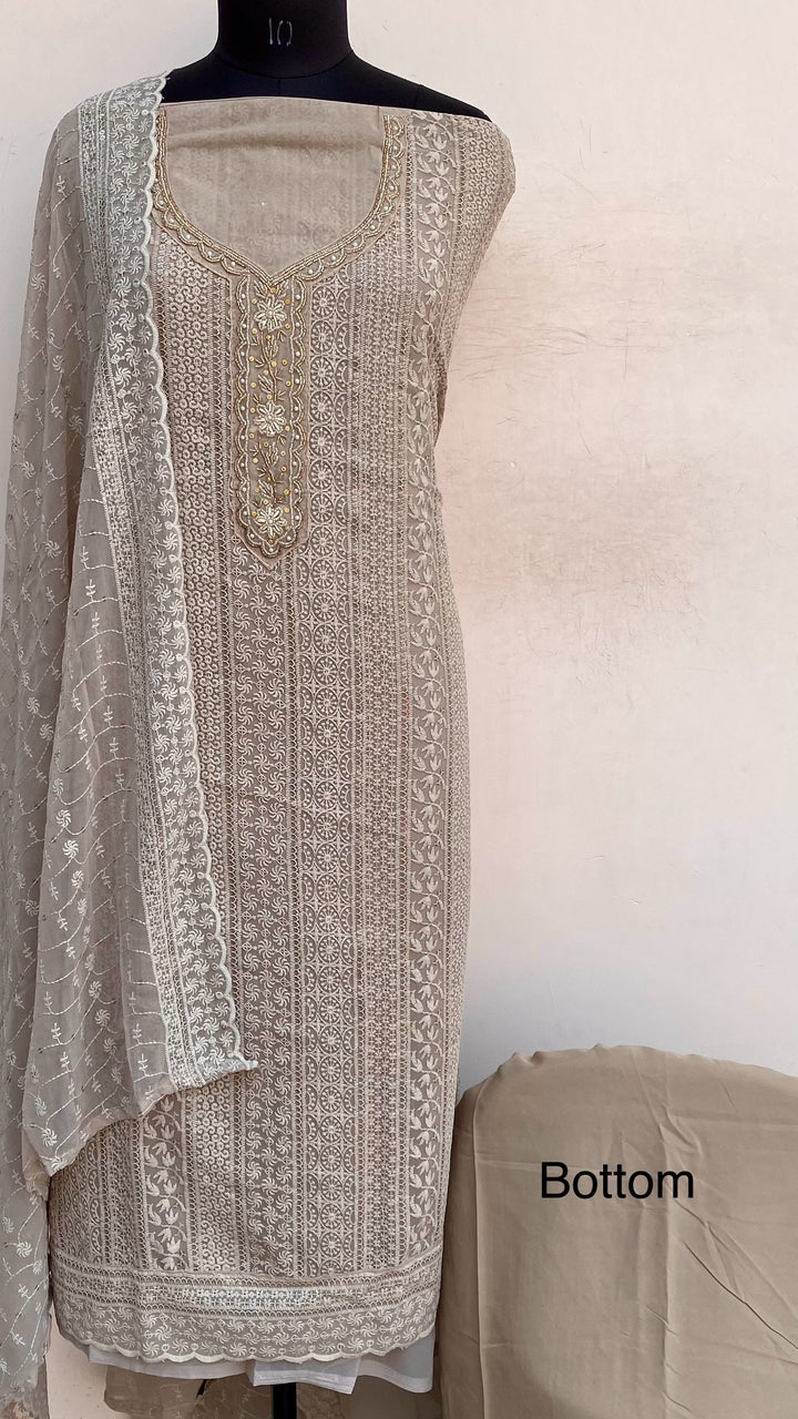 Chikankari Suit Length 3 Piece Beige Georgette With Pearl & Cutdana Work With Embroidered Georgette Dupatta & Same Colour Santoon Bottom
