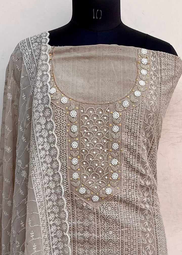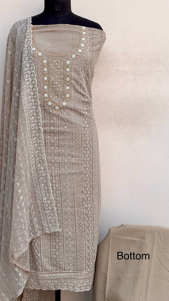 Chikankari Suit Length 3 Piece Beige Georgette With Pearl & Cutdana Work With Embroidered Georgette Dupatta & Same Colour Santoon Bottom