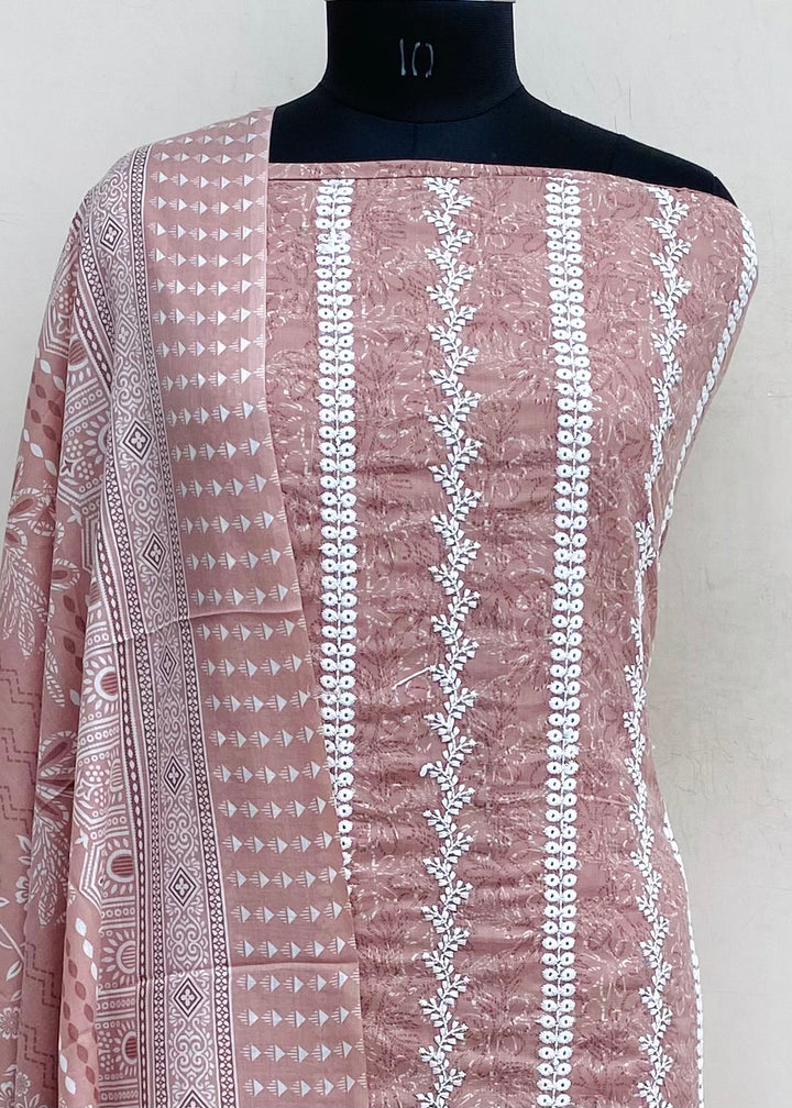 Chikankari Suit Length 3 Piece Copper Cotton With Printed Cotton Dupatta & Same Colour Cotton Bottom
