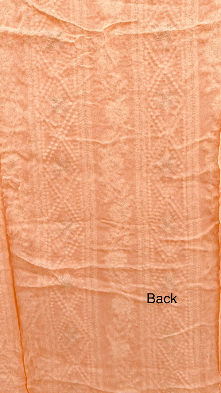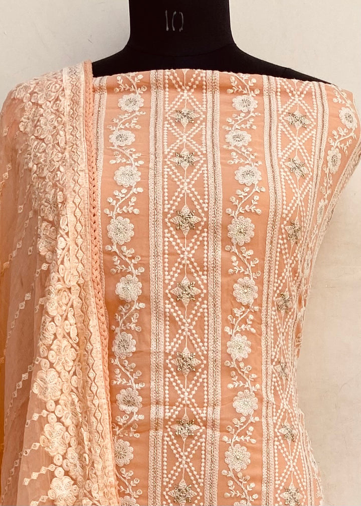 Chikankari Suit Length 3 Piece Peach Georgette With Sequence Work With Embroidered Pure Chiffon Dupatta & Same Colour Cotton Bottom