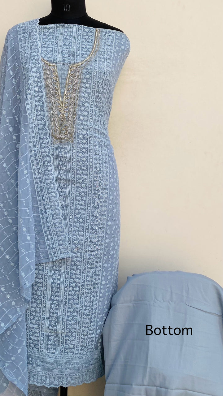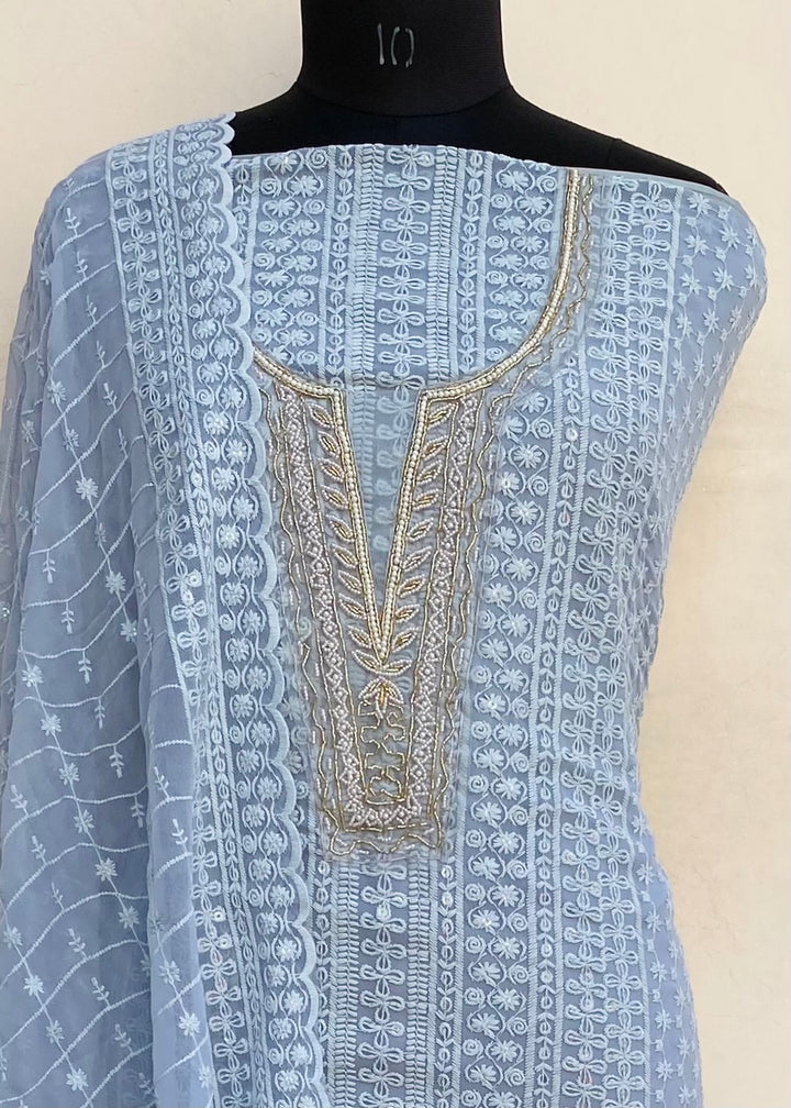 Chikankari Suit Length 3 Piece Gray Georgette With Pearl & Cutdana Work With Embroidered Georgette Dupatta & Same Colour Santoon Bottom