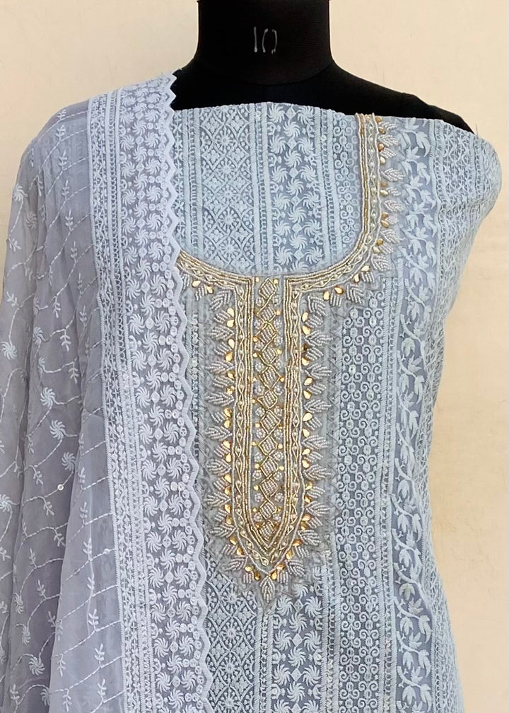Chikankari Suit Length 3 Piece Gray Georgette With Pearl & Cutdana Work