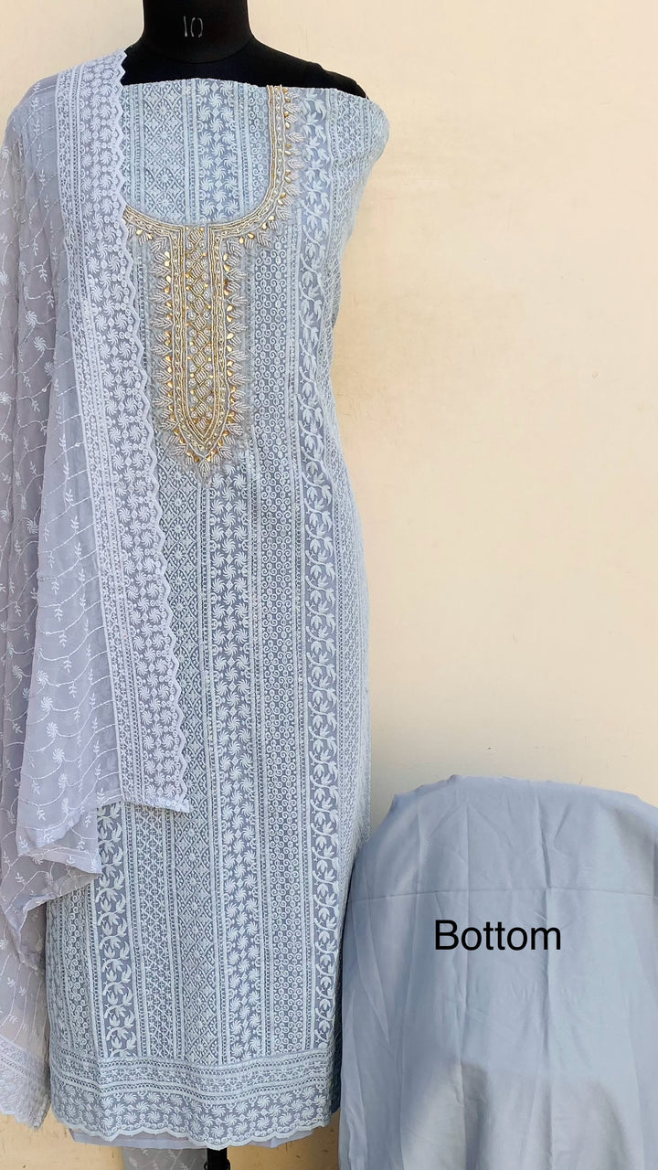 Chikankari Suit Length 3 Piece Gray Georgette With Pearl & Cutdana Work With Embroidered Georgette Dupatta & Same Colour Santoon Bottom