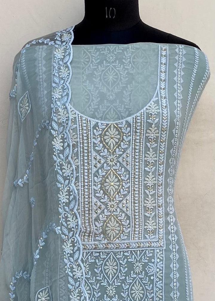 Chikankari Suit Length 3 Piece Gray Georgette With Sequence Work