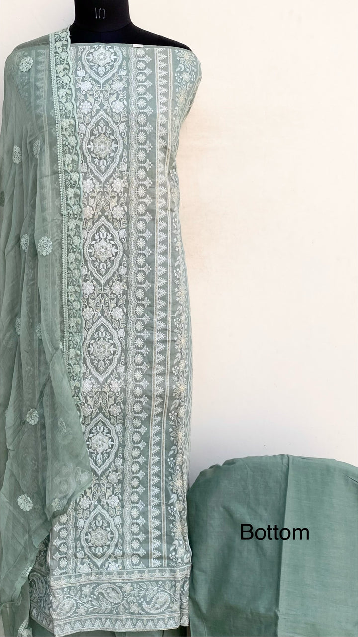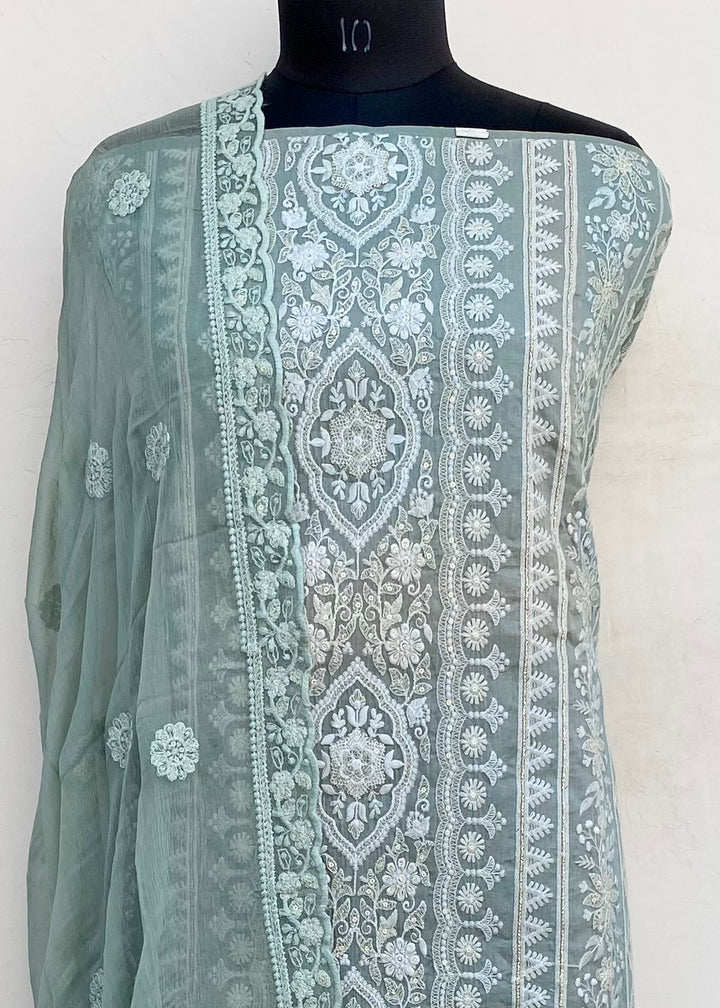 Chikankari Suit Length 3 Piece Green Cotton With Sequence Work With Embroidered Pure Chiffon Dupatta & Same Colour Cotton Bottom