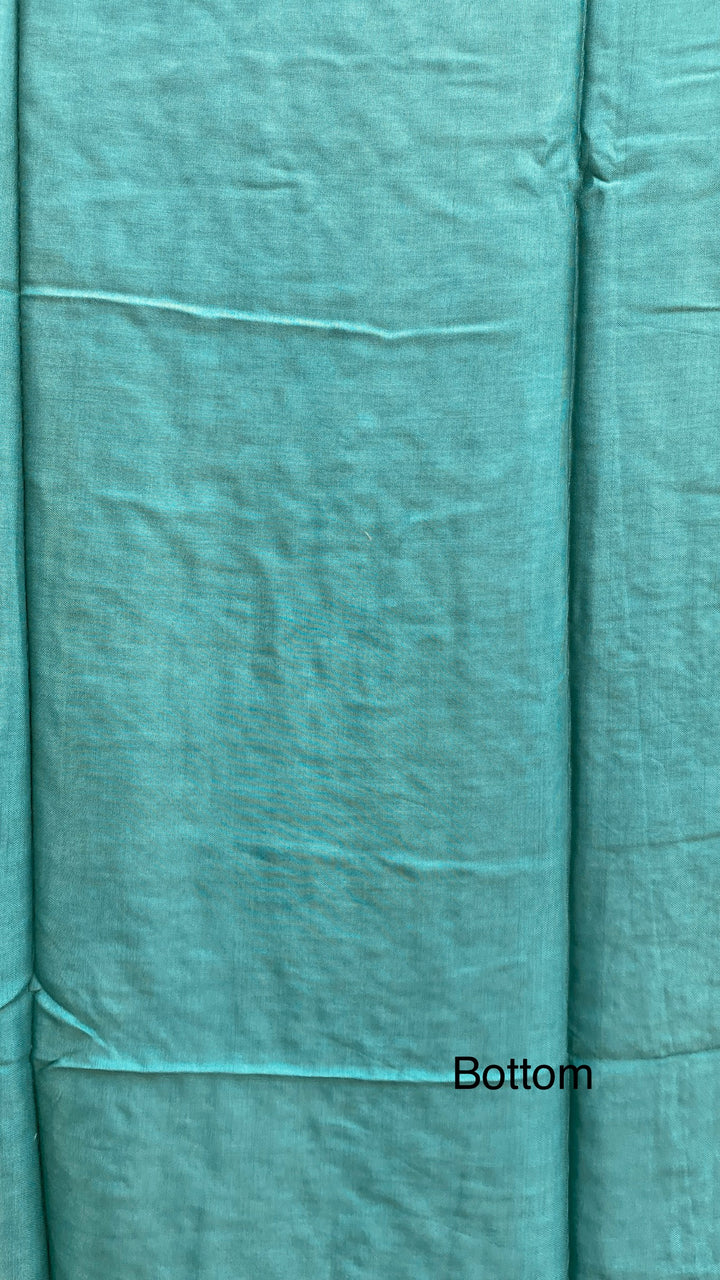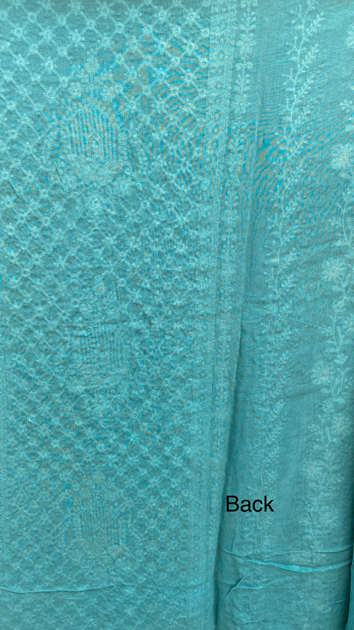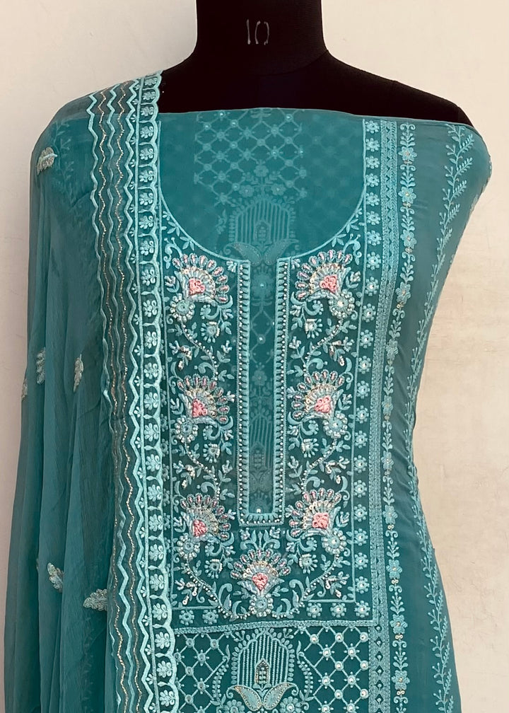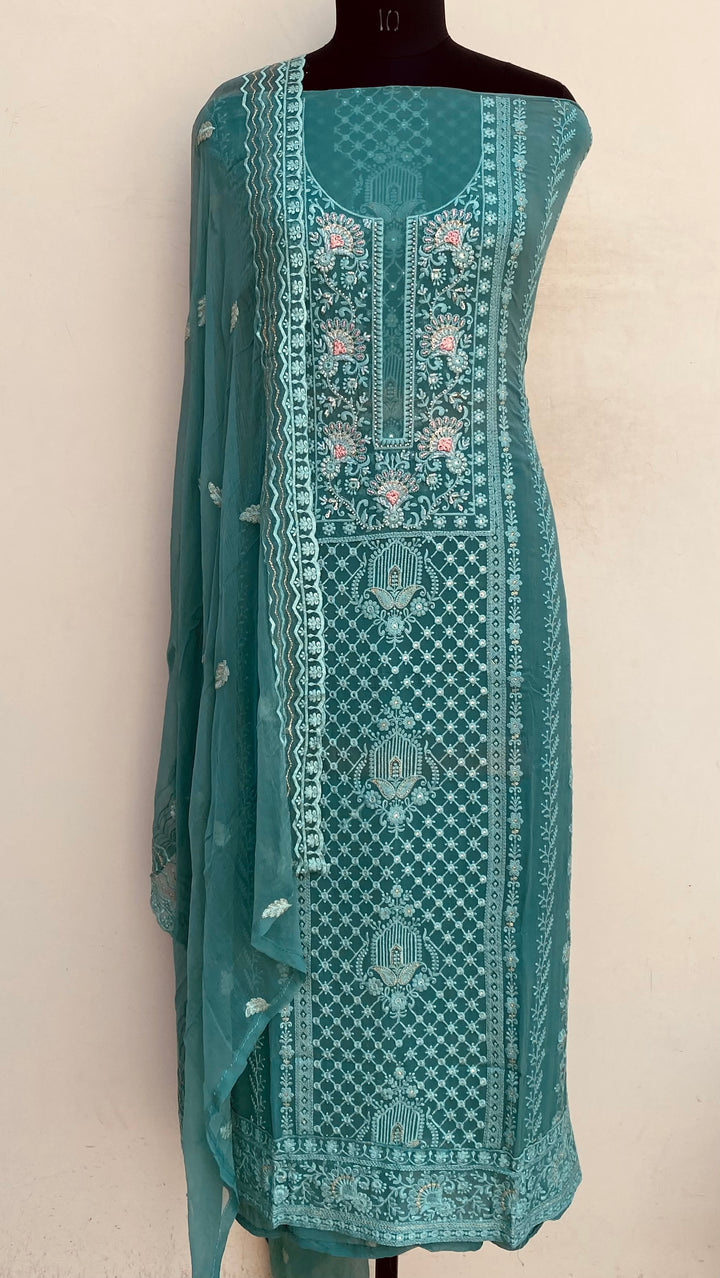 Chikankari Suit Length 3 Piece Green Georgette With Cutdana , Pearl & Sequence Work With Embroidered Pure Chiffon Dupatta & Same Colour Cotton Bottom