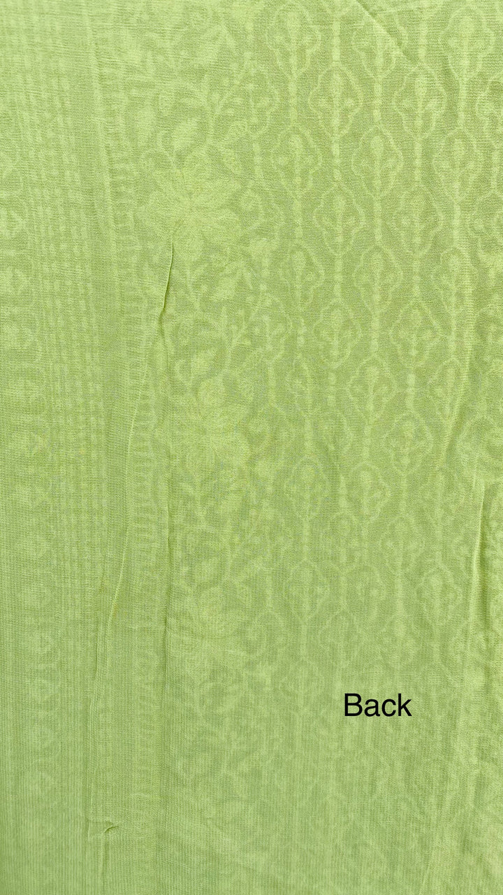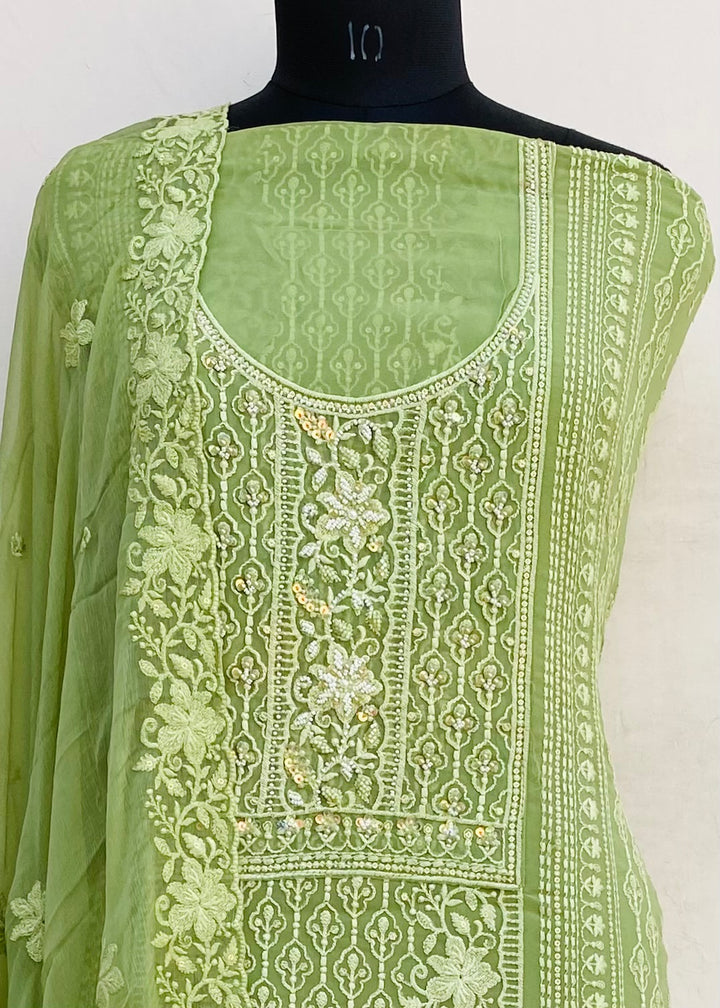 Chikankari Suit Length 3 Piece Green Georgette With Sequence ,Pearl & Cutdana Work With Embroidered Pure Chiffon Dupatta & Same Colour Cotton Bottom