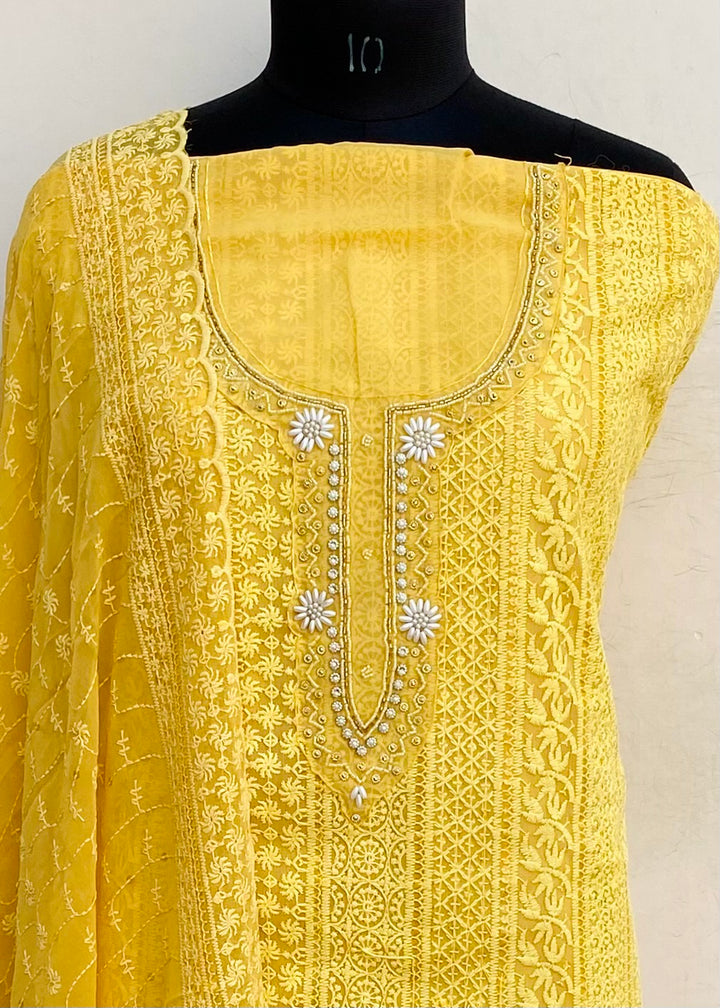 Chikankari Suit Length 3 Piece Mustard Georgette With Pearl & Cutdana Work