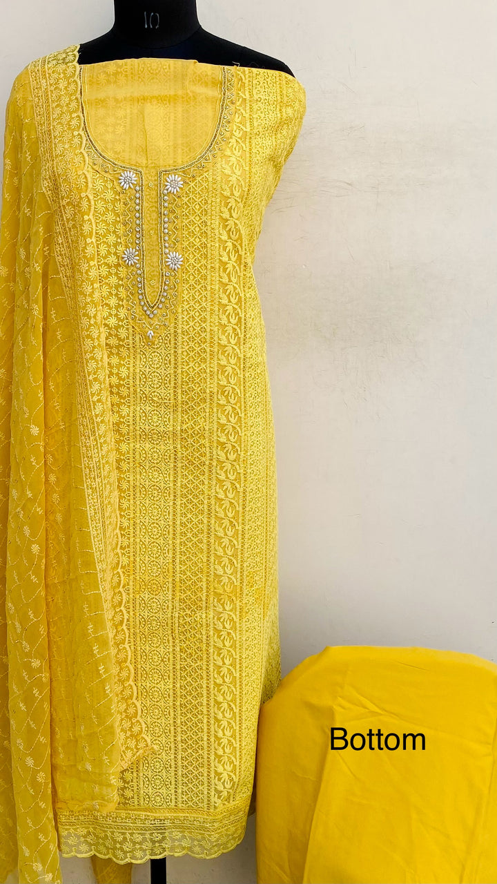 Chikankari Suit Length 3 Piece Mustard Georgette With Pearl & Cutdana Work With Embroidered Georgette Dupatta & Same Colour Santoon Bottom