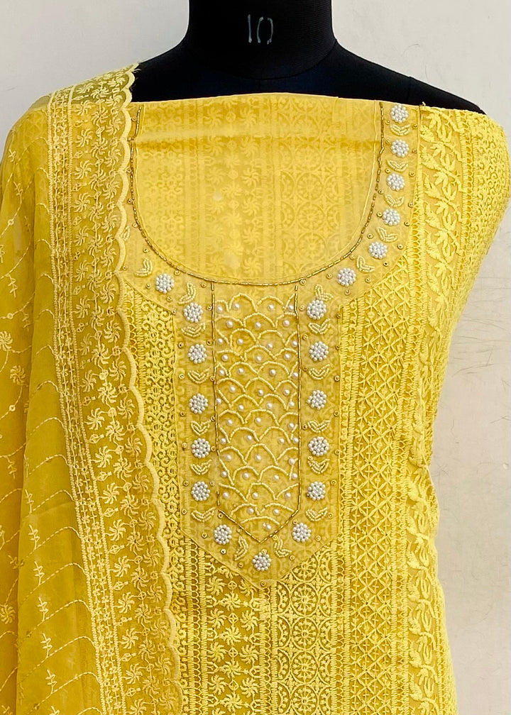 Chikankari Suit Length 3 Piece Mustard Georgette With Pearl & Cutdana Work