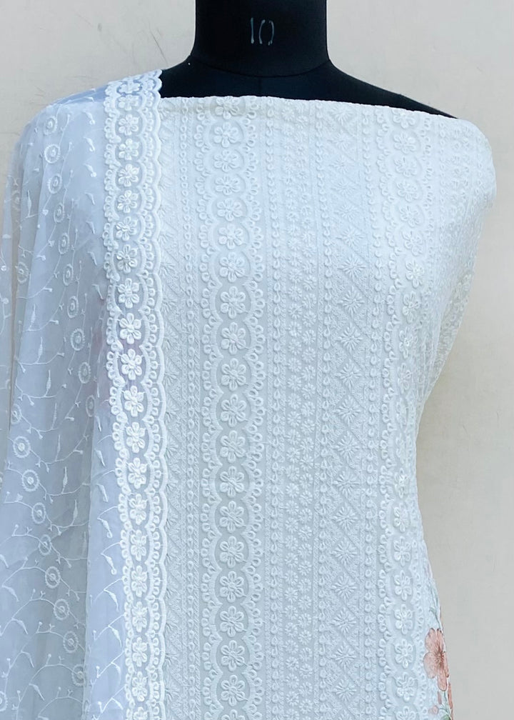 Chikankari Suit Length 3 Piece Off White Georgette With Embroidered Georgette Dupatta & Same Colour Santoon Bottom