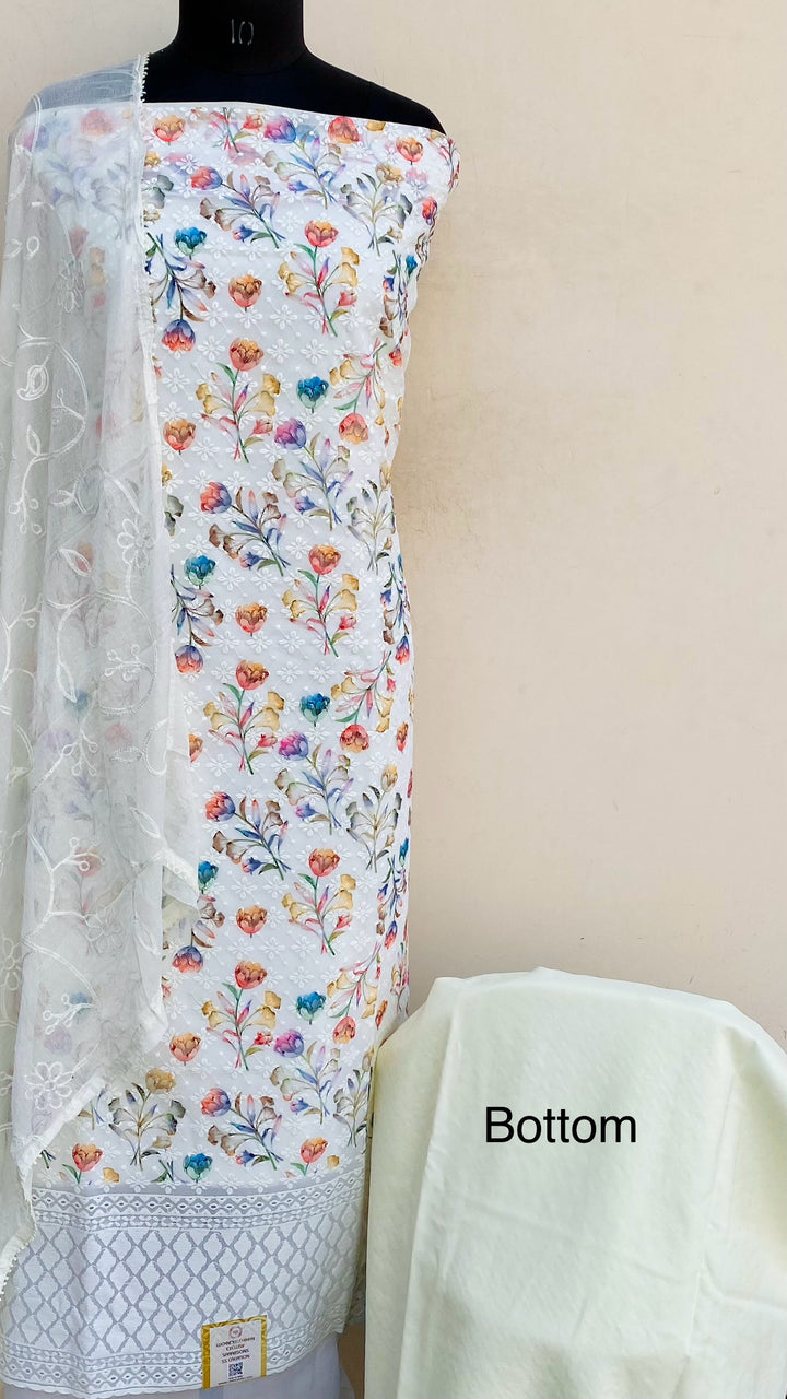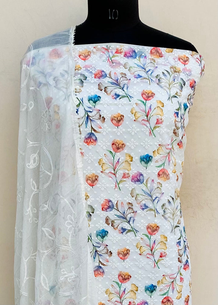 Chikankari Suit Length 3 Piece Off White Georgette With Embroidered Pure Chiffon Dupatta & Same Colour Santoon Bottom