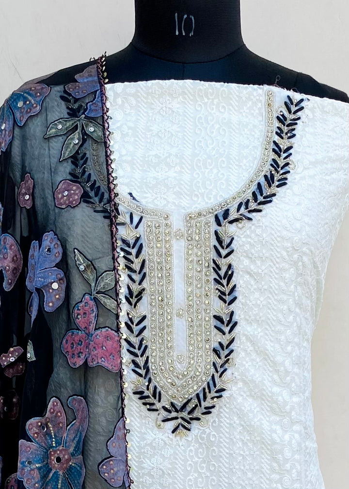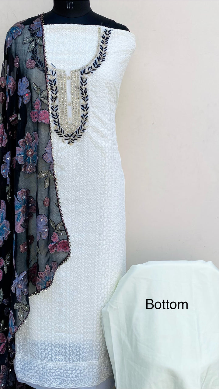 Chikankari Suit Length 3 Piece Off White Georgette With Cutdana & Pearl Work With Printed Georgette Dupatta & Same Colour Santoon Bottom