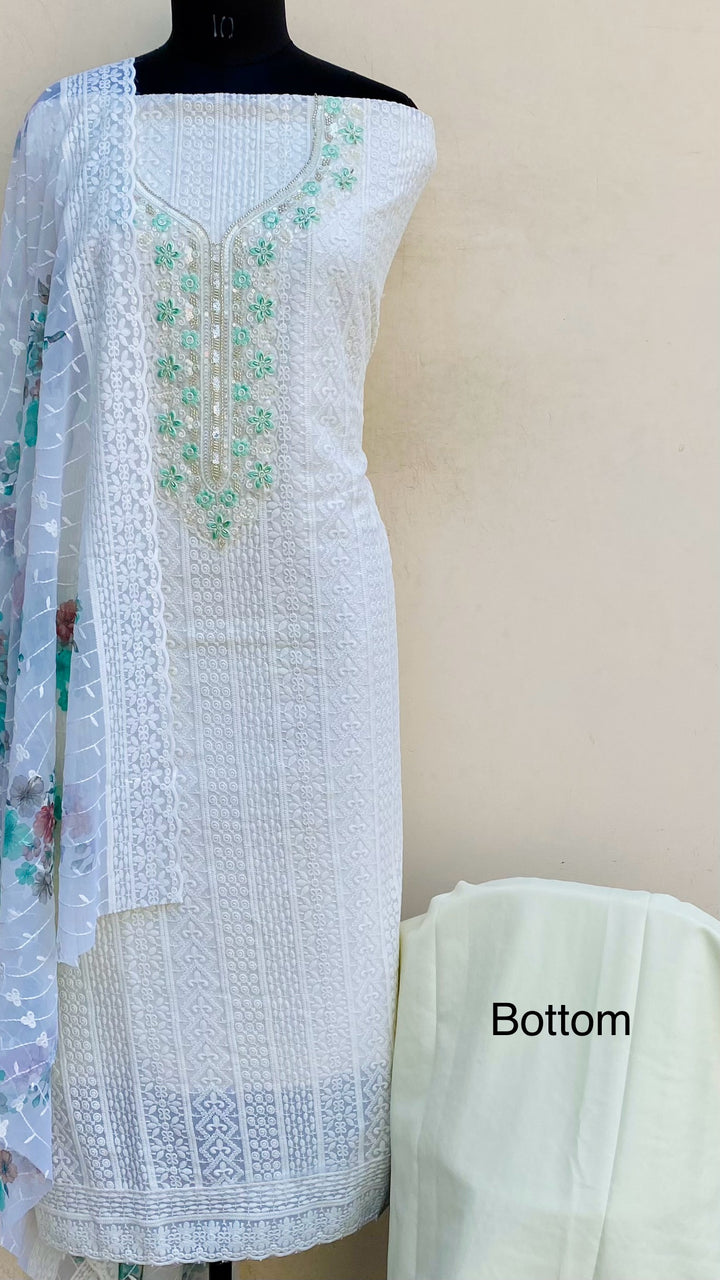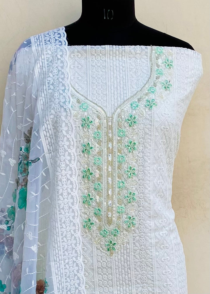 Chikankari Suit Length 3 Piece Off White Georgette With Cutdana & Sequence Work With Embroidered Georgette Dupatta & Same Colour Santoon Bottom