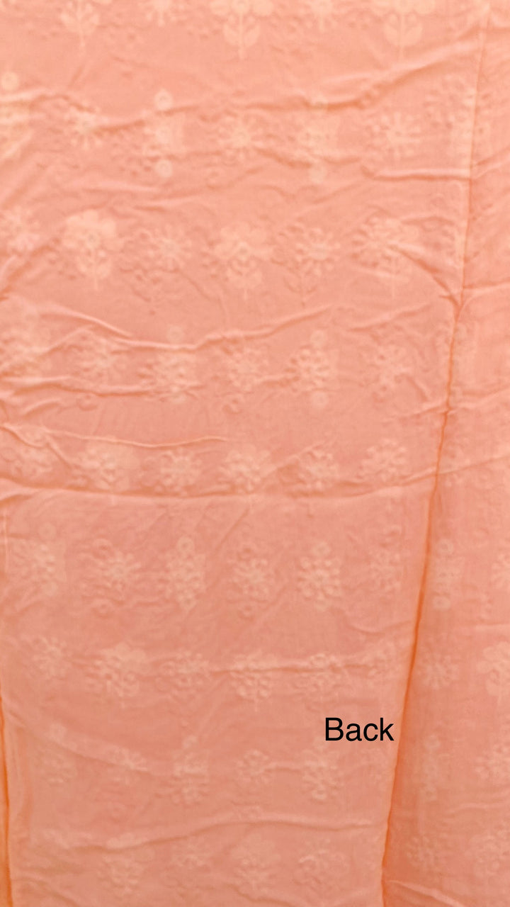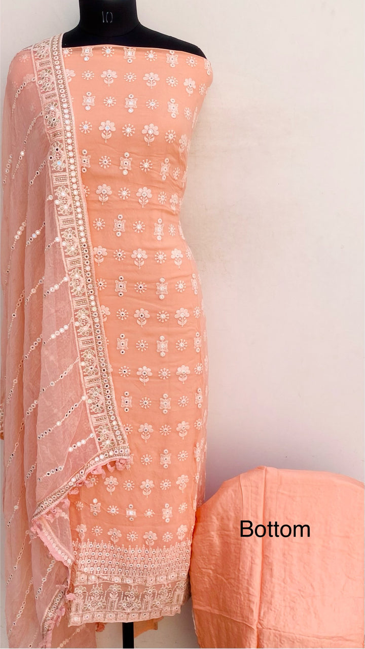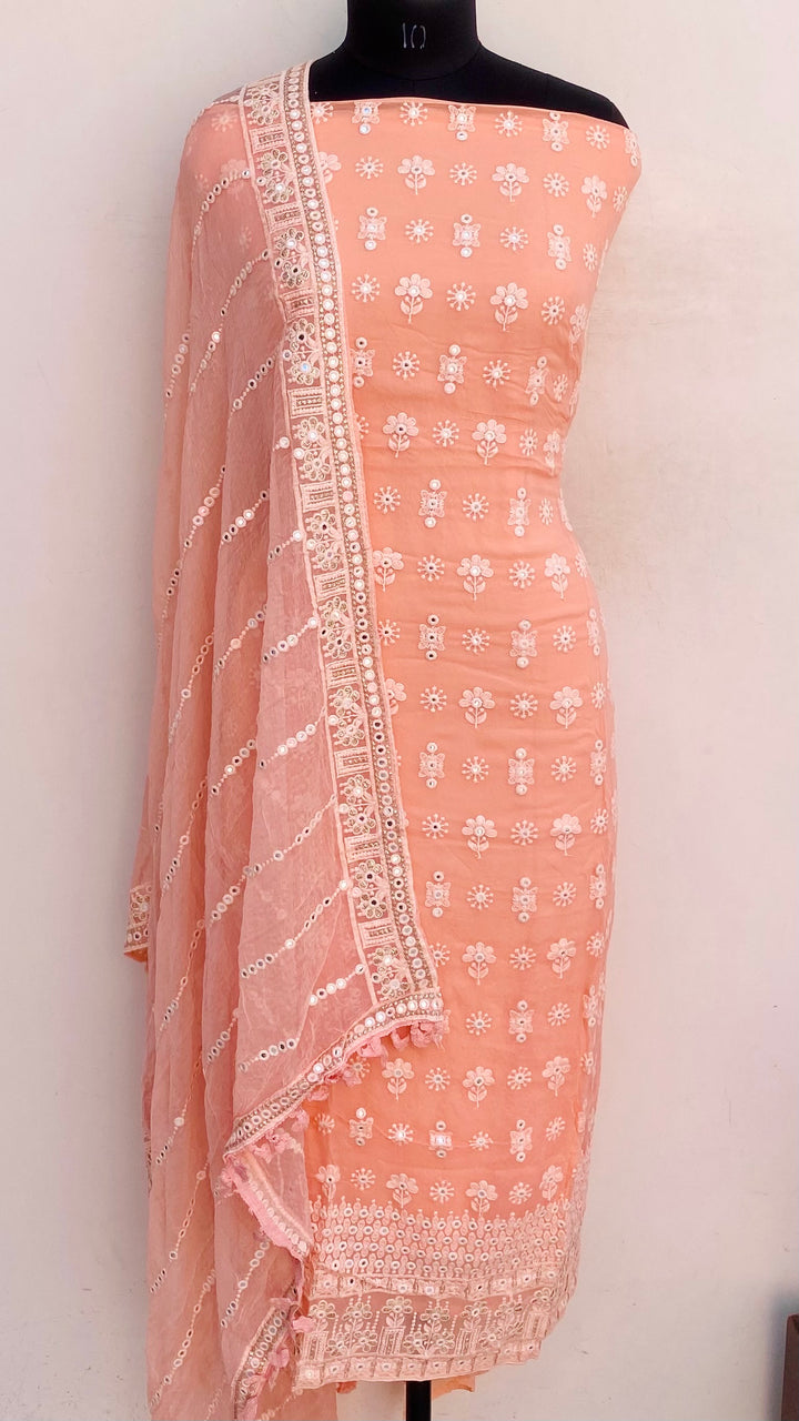 Chikankari Suit Length 3 Piece Peach Georgette With Embroidered Pure Chiffon Dupatta & Same Colour Cotton Bottom
