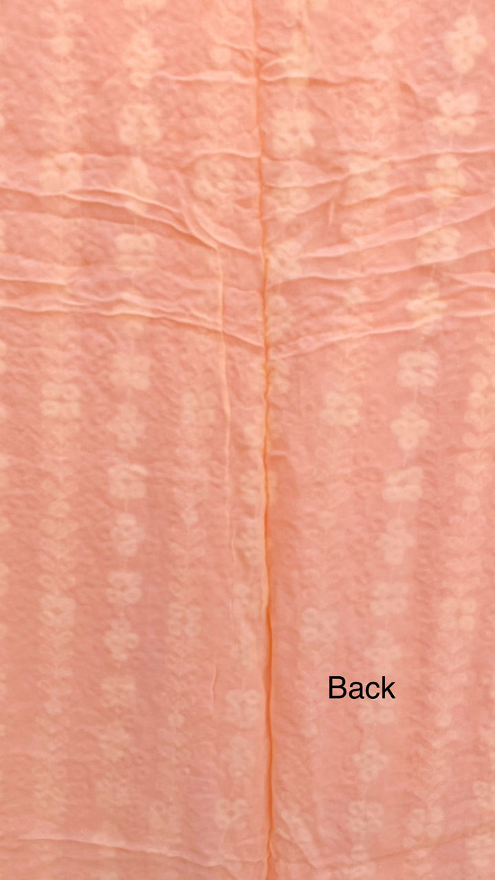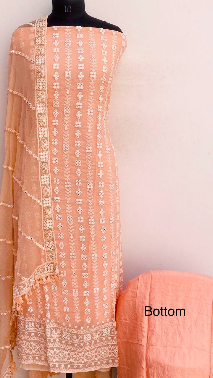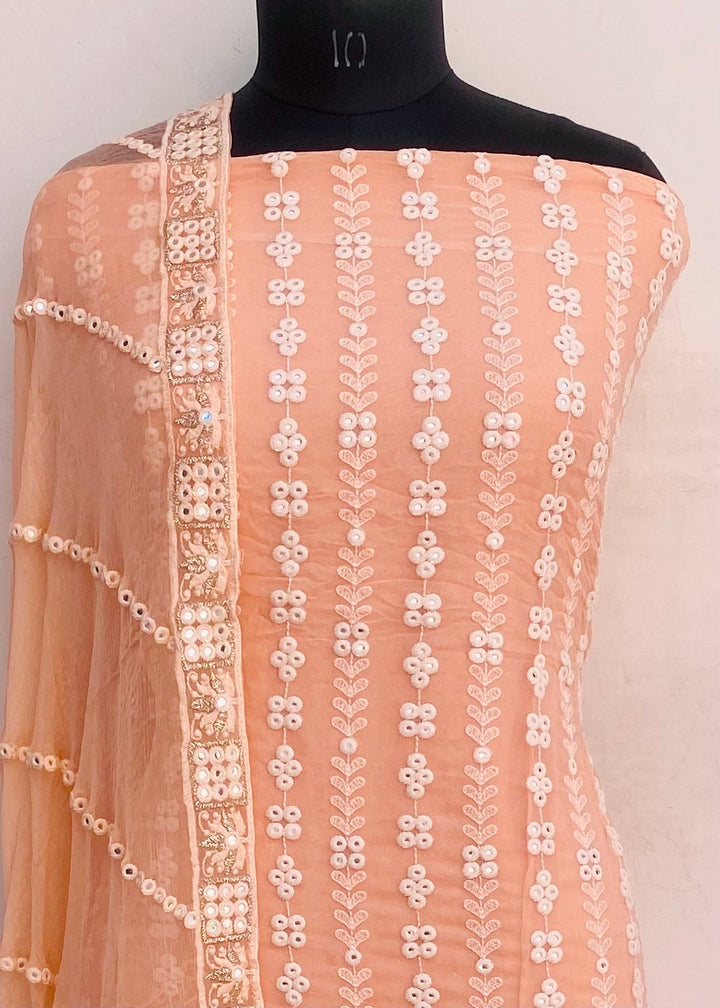 Chikankari Suit Length 3 Piece Peach Georgette With Embroidered Pure Chiffon Dupatta & Same Colour Cotton Bottom