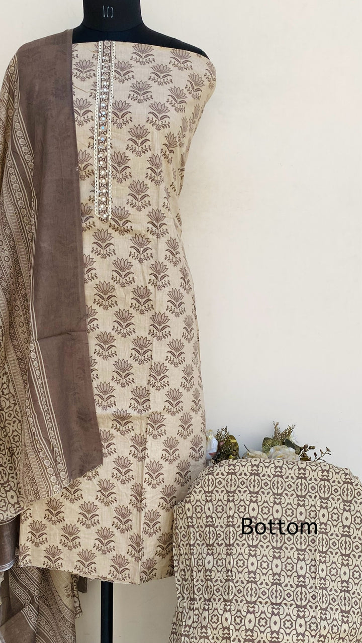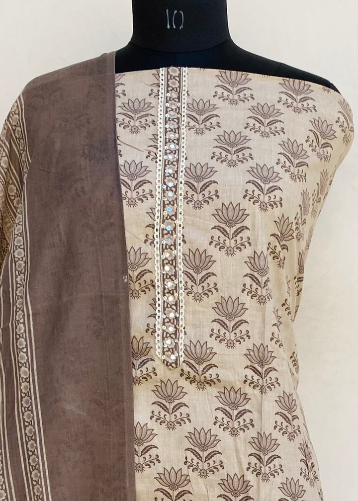 Designer Embroidered Suit Length 3 Piece Beige Mal Cotton With Printed Mal Cotton Dupatta & Printed Same Colour Cotton Bottom