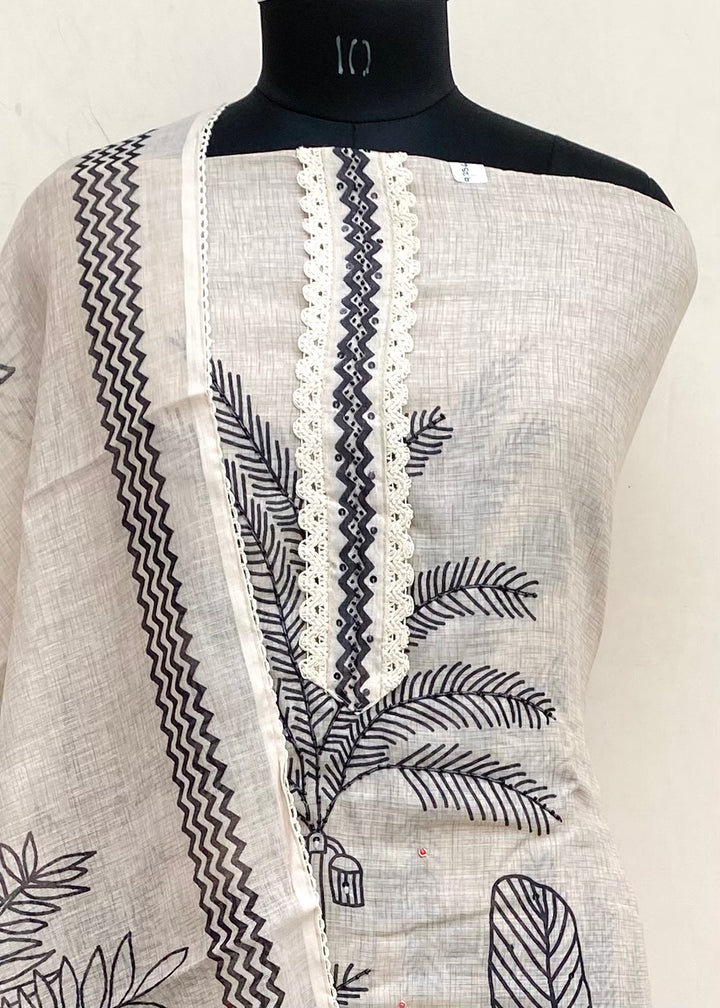 Designer Embroidered Suit Length 3 Piece Beige Linen With Pearl & Sequence Work With Printed Linen Dupatta & Same Colour Cotton Bottom