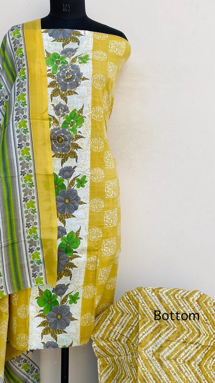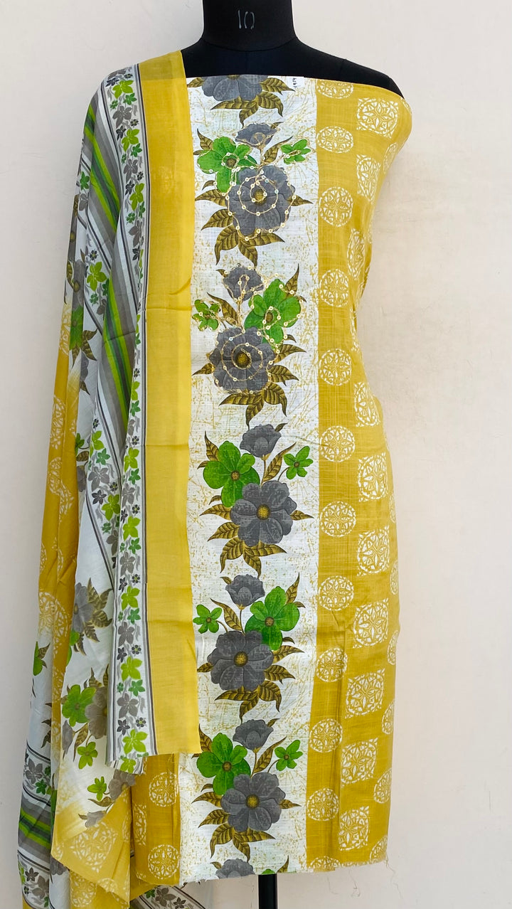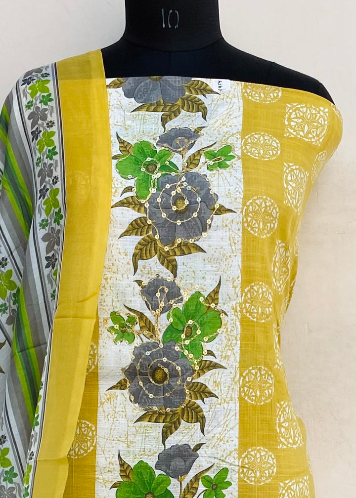 Designer Embroidered Suit Length 3 Piece Beige Linen With Sequence Work With Printed Mal Cotton Dupatta & Printed Same Colour Cotton Bottom