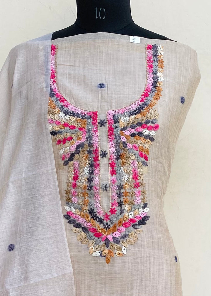 Designer Embroidered Suit Length 3 Piece Beige Linen With Sequence Work With Embroidered Linen Dupatta & Same Colour Santoon Bottom