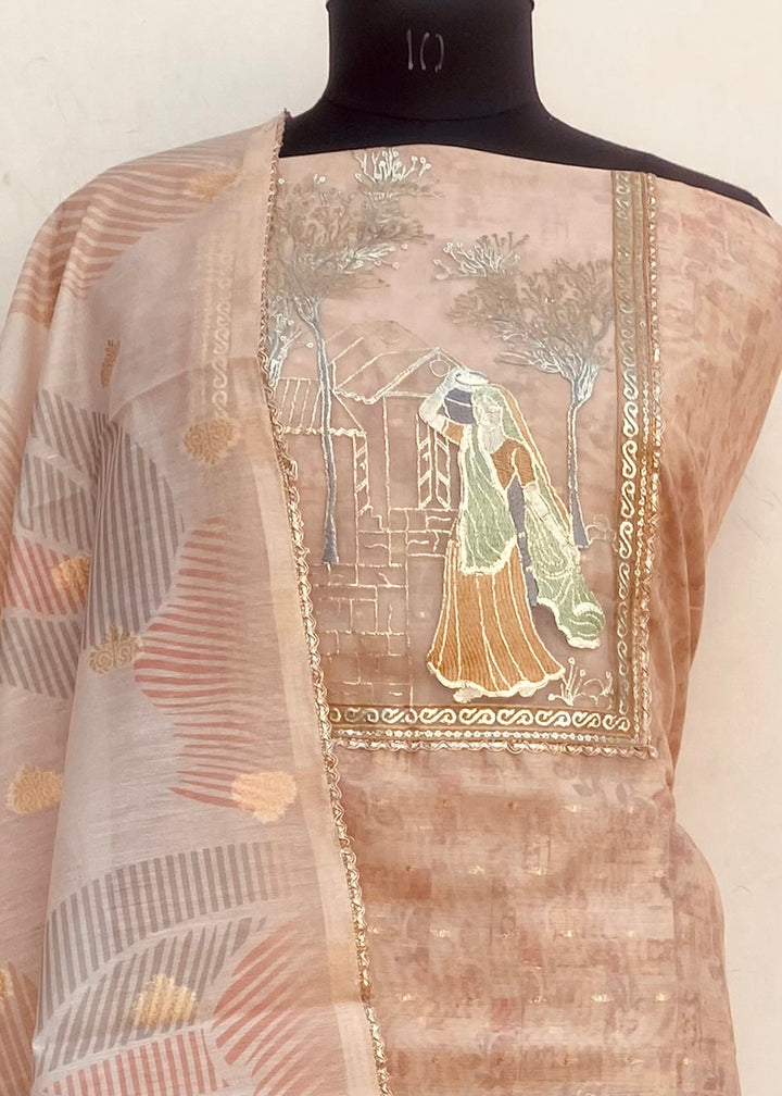 Designer Embroidered Suit Length 3 Piece Beige Mal Chanderi With Sequence Work