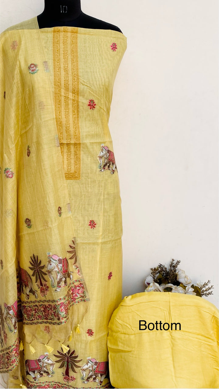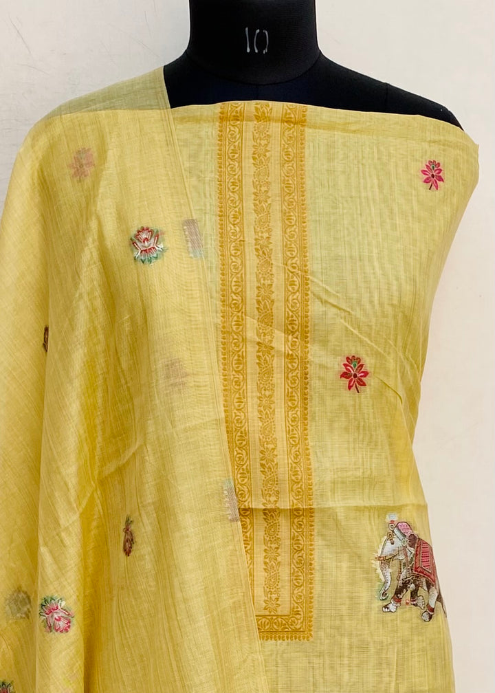 Designer Embroidered Suit Length 3 Piece Beige Mal Chanderi With Embroidered Mal Chanderi Dupatta & Same Colour Cotton Bottom