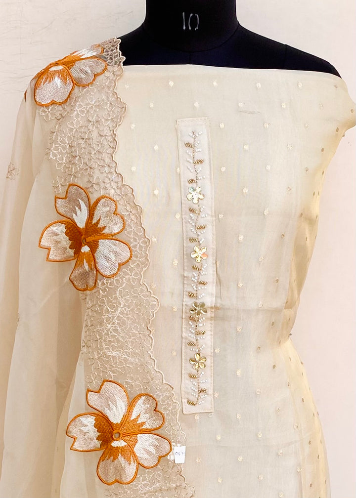 Designer Embroidered Suit Length 3 Piece Beige Mal Chanderi With Mirror, Pearl & Sequence Work With Embroidered Organza Dupatta & Same Colour Cotton Bottom