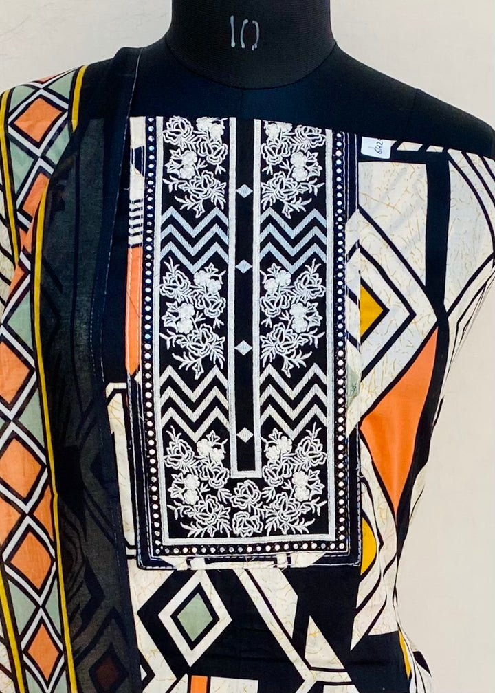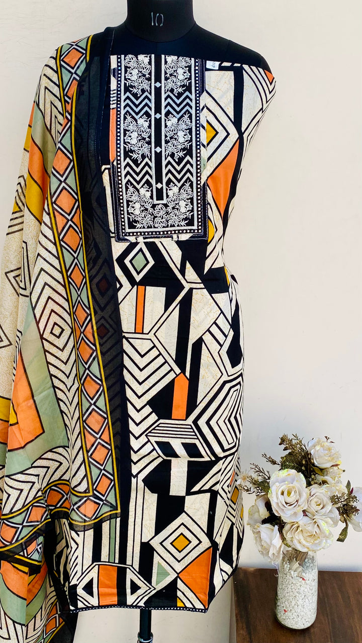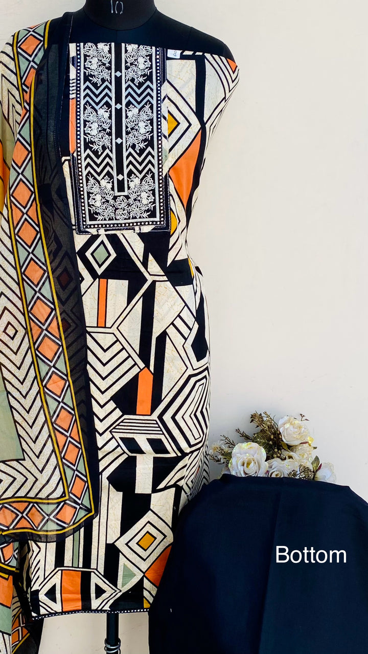Designer Embroidered Suit Length 3 Piece Beige Mal Cotton With Printed Mal Cotton Dupatta & Black Colour Cotton Bottom