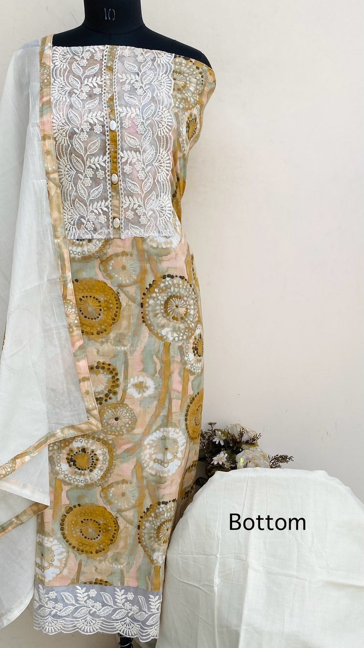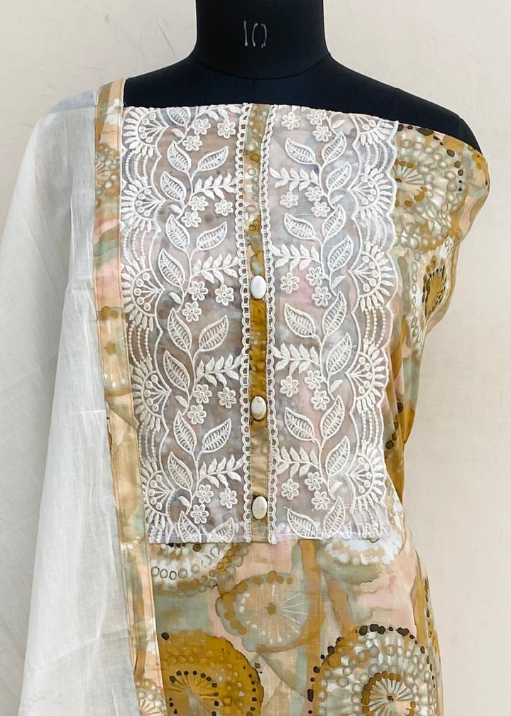 Designer Embroidered Suit Length 3 Piece Beige Mal Cotton With Sequence Work With Embroidered Mal Cotton Dupatta & Cream Colour Cotton Bottom