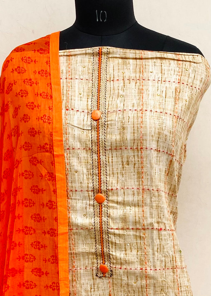 Designer Embroidered Suit Length 3 Piece Beige Mal Cotton With Sequence Work With Printed Pure Chiffon Dupatta & Orange Colour Cotton Bottom