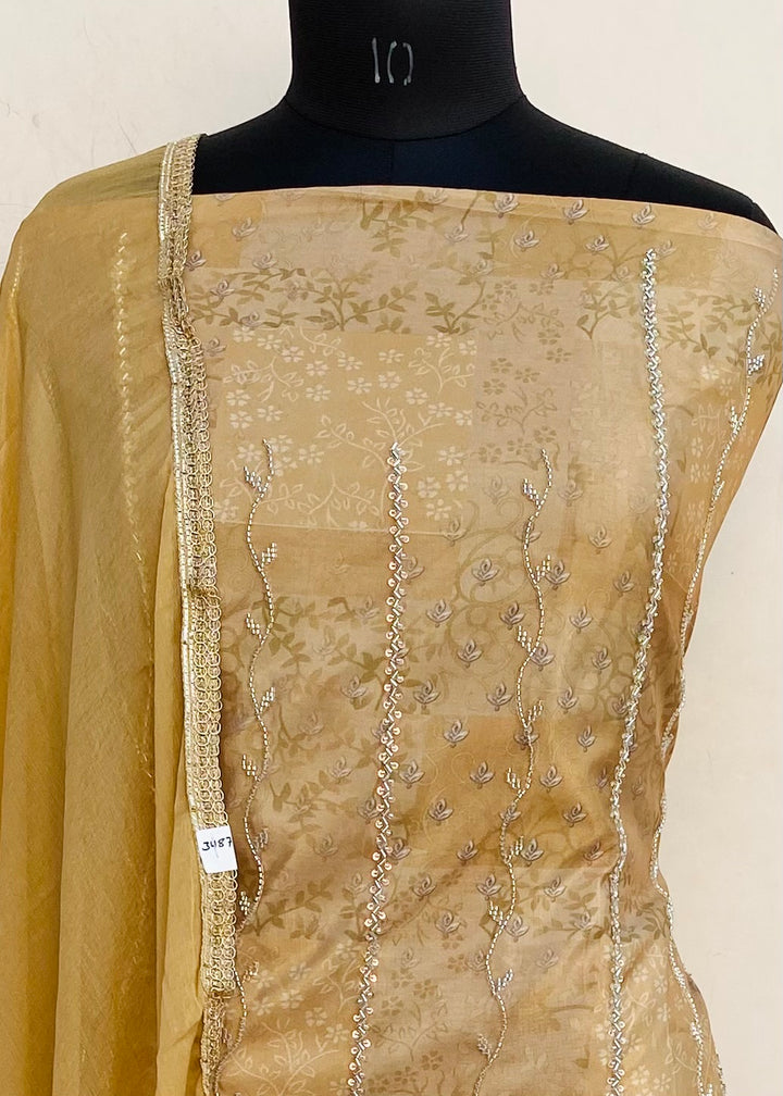 Designer Embroidered Suit Length 3 Piece Beige Muslin Cotton With Cutdana & Sequence Work