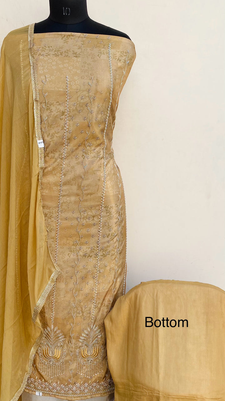 Designer Embroidered Suit Length 3 Piece Beige Muslin Cotton With Cutdana & Sequence Work With Pure Chiffon Dupatta & Same Colour Cotton Bottom