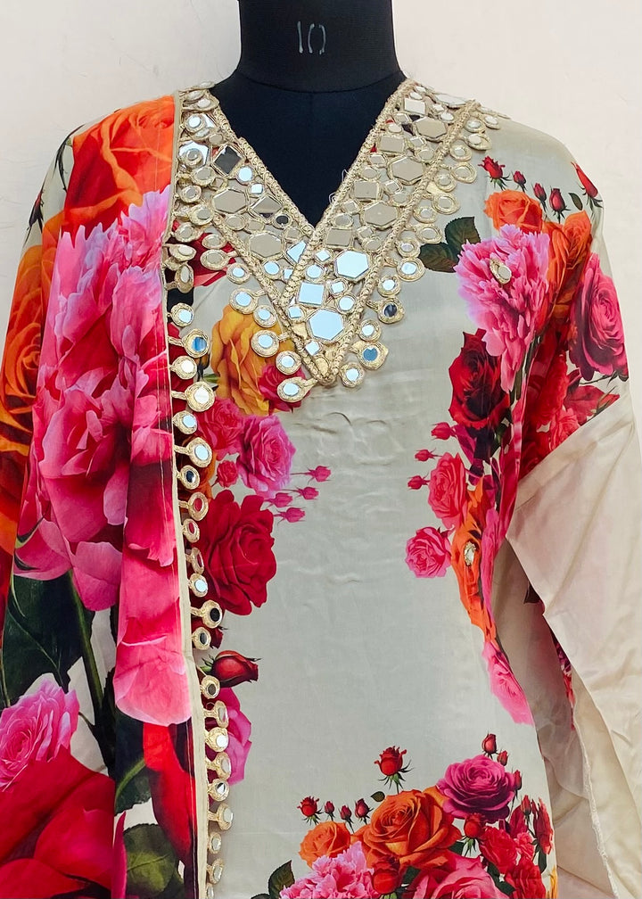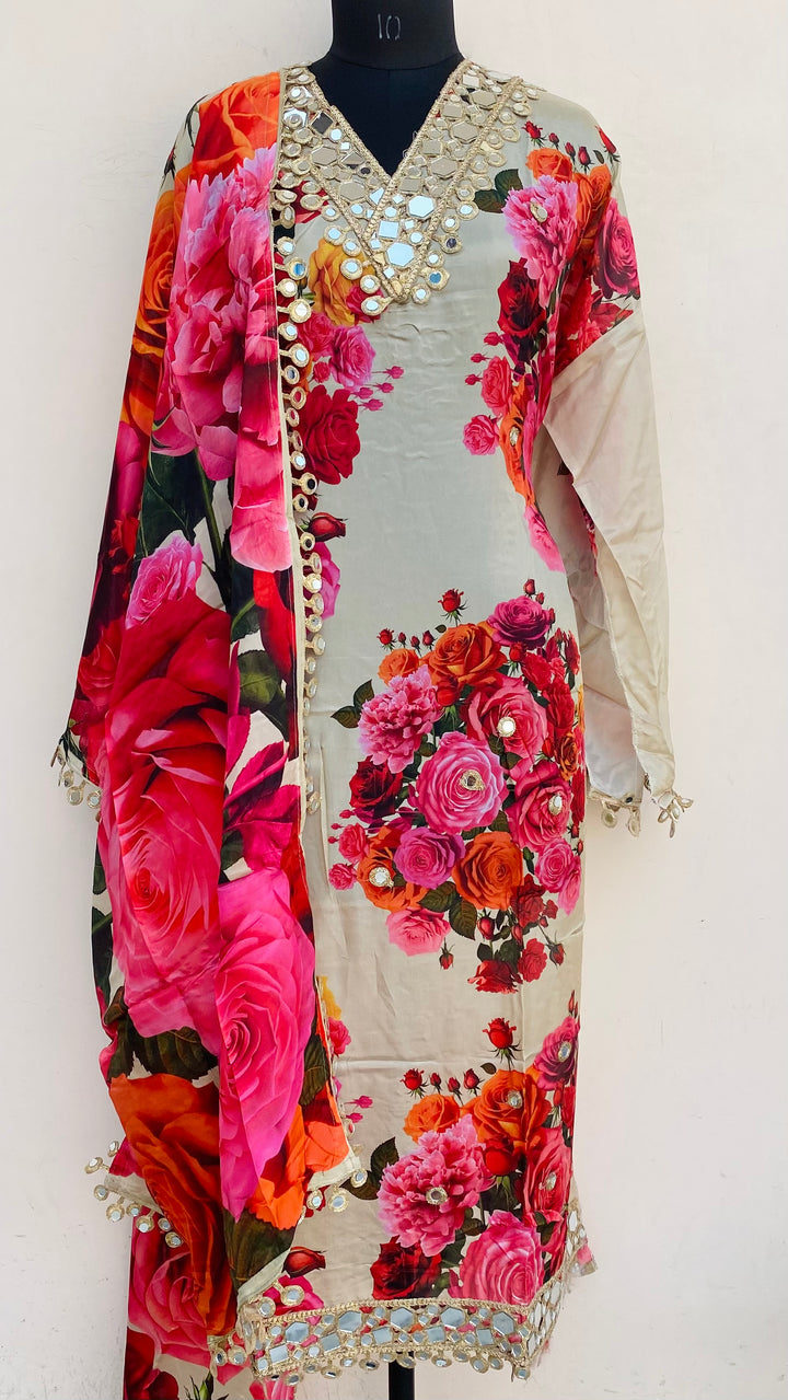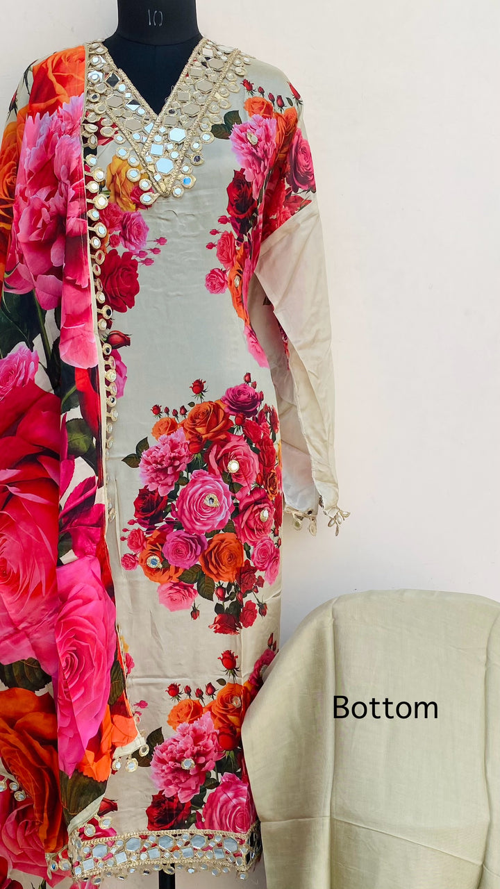Designer Embroidered Suit Length 3 Piece Beige Muslin Cotton With Mirror Work With Printed Muslin Dupatta & Same Colour Cotton Bottom