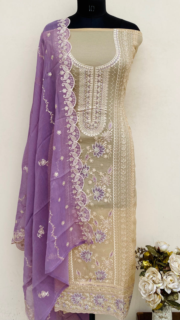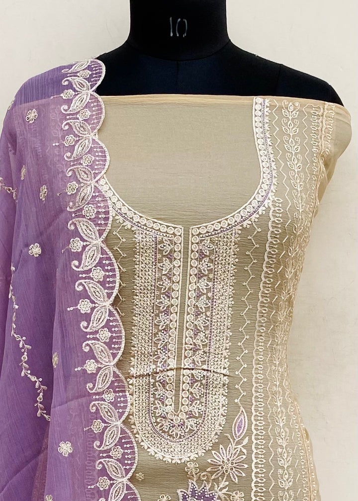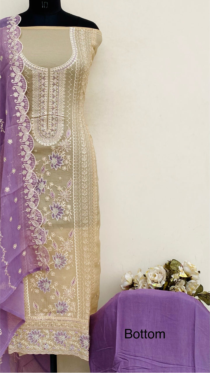 Designer Embroidered Suit Length 3 Piece Beige Organza With Sequence & Stone Work With Embroidered Organza Dupatta & Purple Colour Cotton Bottom